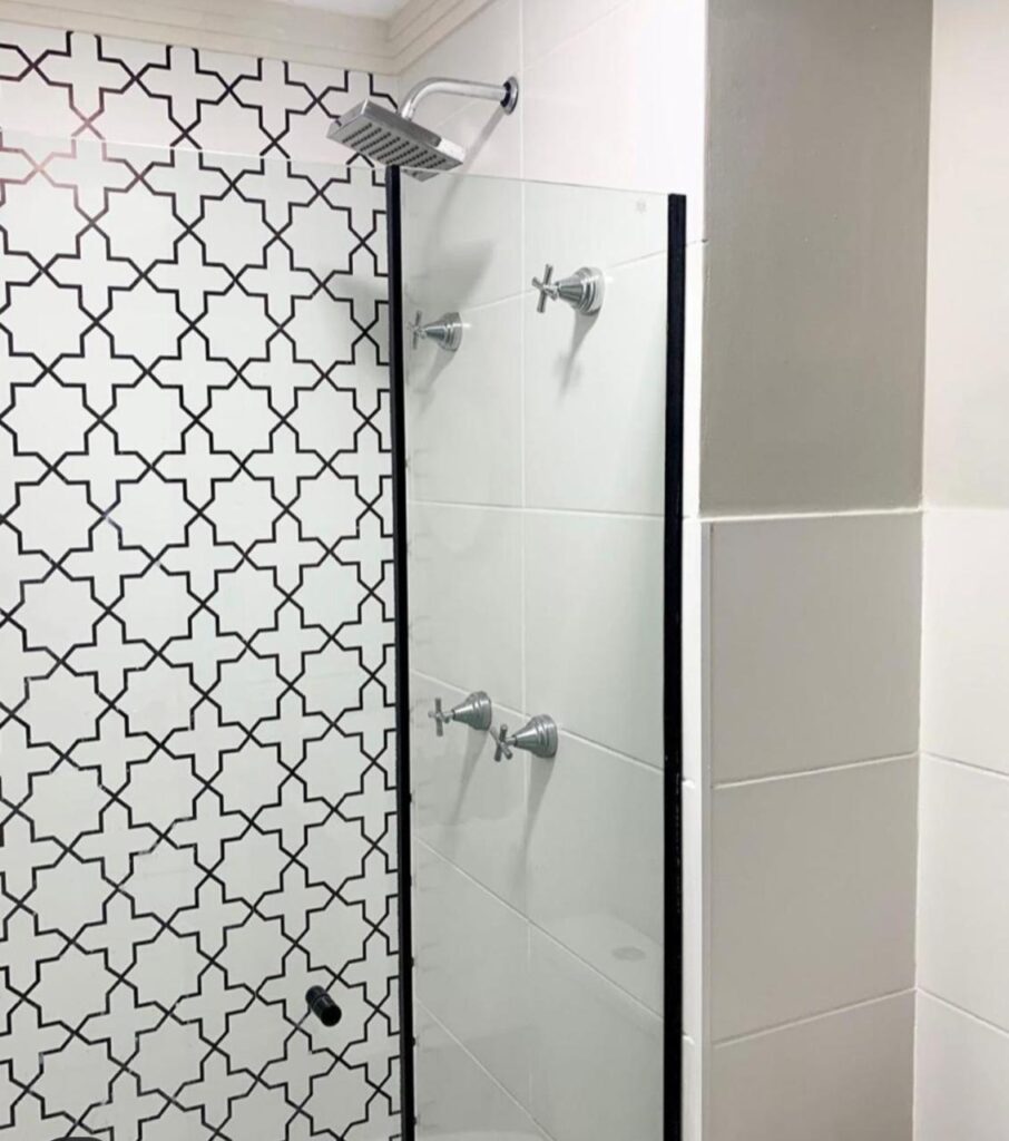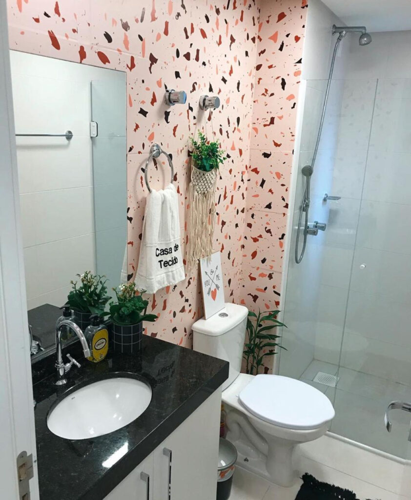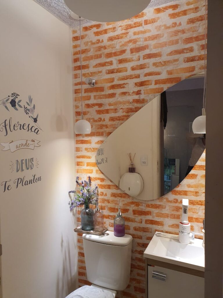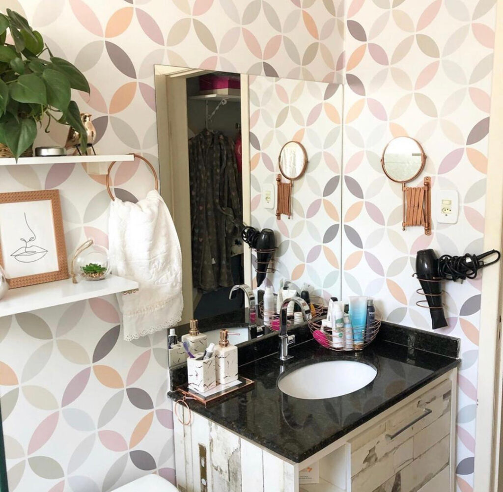 O uso de papéis de parede também é uma ótima solução para decoração de banheiro pequeno. Há tipos que agradam todos os gostos: lisos, 3D e geométricos. É só escolher o que mais combina com seu estilo. Preste atenção também nos móveis e suportes para produtos de higiene, papéis, toalhas de rosto e banho! Eles ajudam a dar uma outra cara para o ambiente.